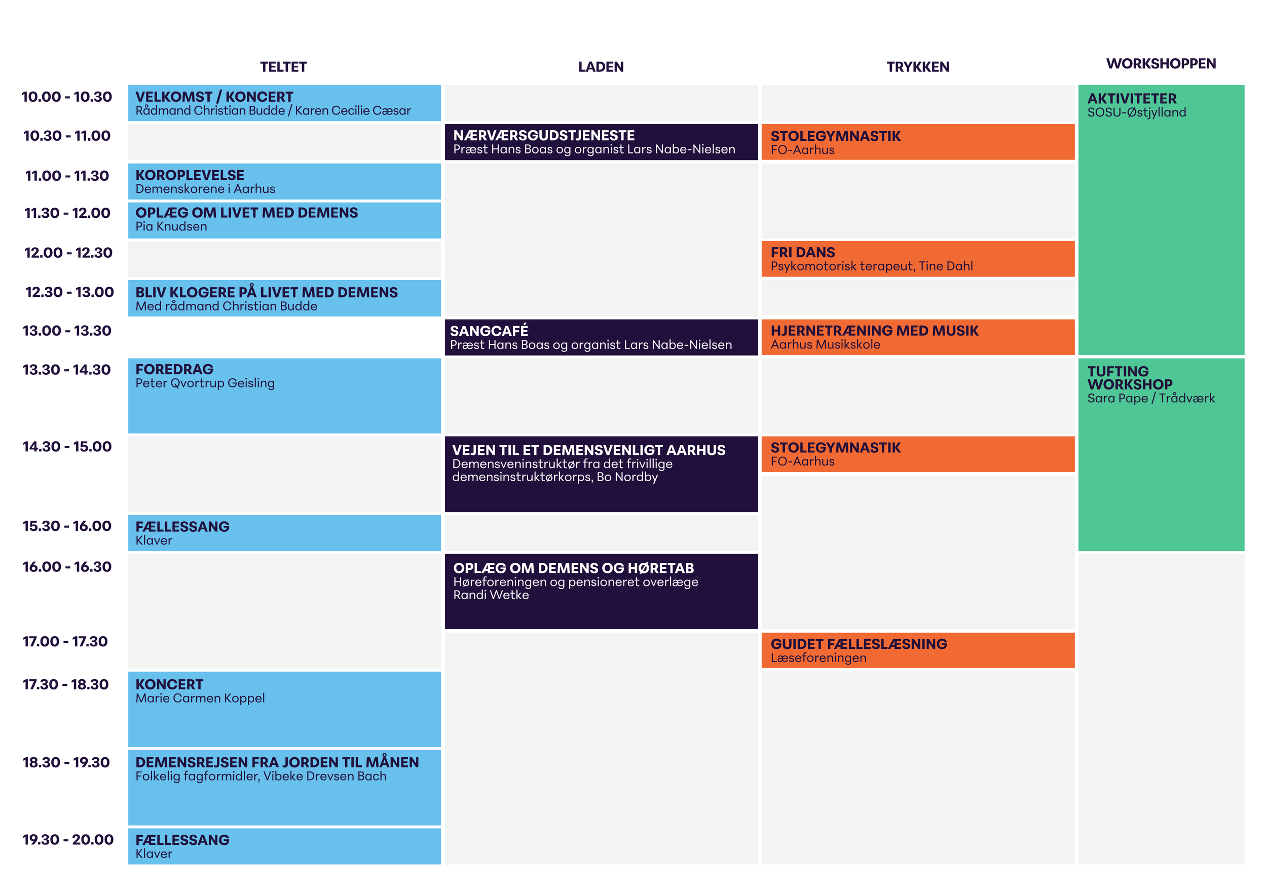 Herunder kan du danne dig et overblik over, hvornår de forskellige indslag er programsat. Du er velkommen når som helst – og til at blive så længe, det giver mening for dig.